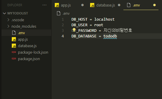 그럼 이제 database.js에 작성했던 dbconfig 변수에 .env파일의 내용을 불러와 넣을건데요.