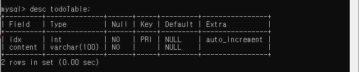 이번에 만들 TodoList에 기본적으로 필요한 칼럼은 할일목록이 담긴 content와 각각의 컨텐츠의 고유 번호 idx가 되겠습니다.