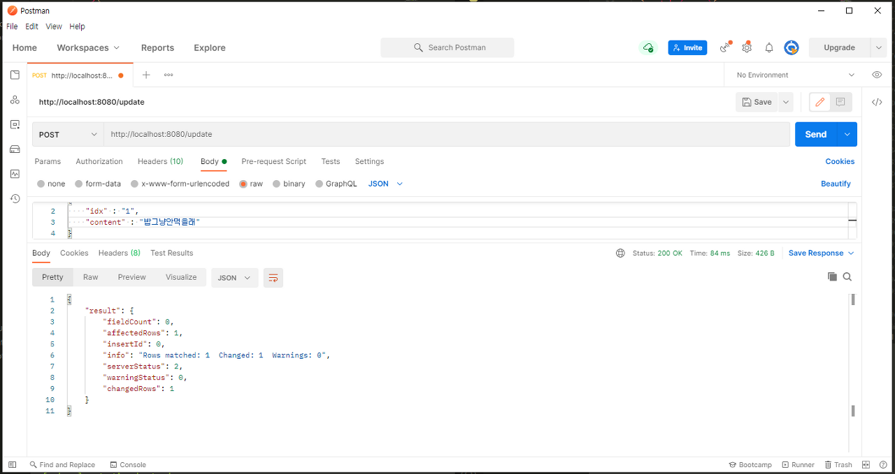 body에서 수정할 할일의 고유번호인 idx값을 받아오고 content에는 수정할 내용을 입력하여 받아옵니다.