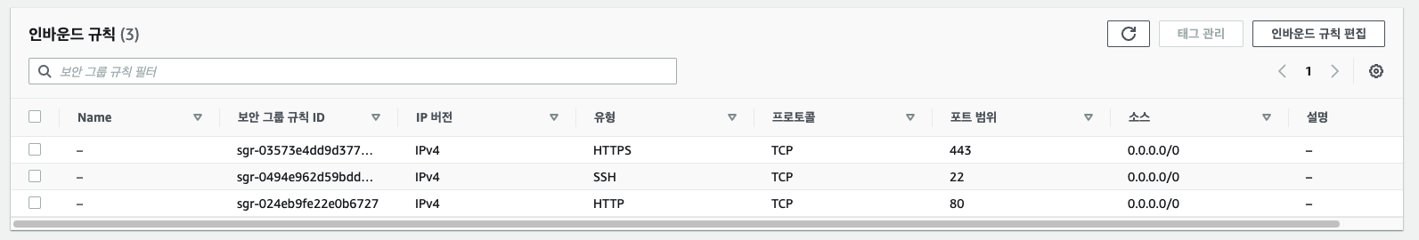 4. 보안그룹은 아래 형식으로 만들어둔 보안그룹으로 선택하였습니다. https를 허용해주는 방식입니다.